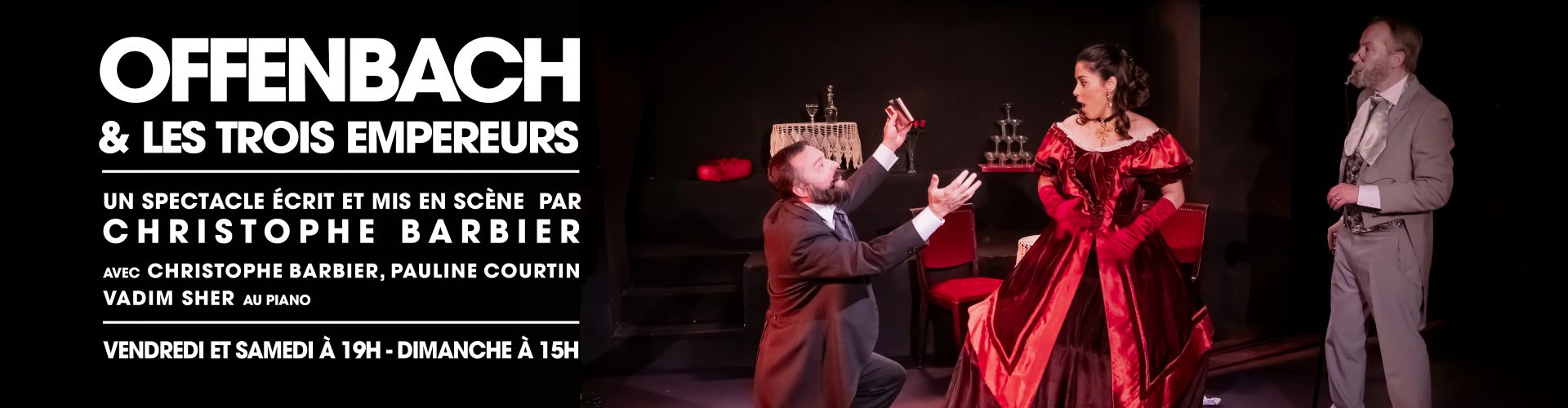 Christophe Barbier, pas barbant du tout en Offenbach, arbore une belle paire de rouflaquettes, Pauline Courtin se réincarne avec brio en la diva Hortense Schneider (…) accompagnés par un mystérieux pianiste « Empereur russe » joué par Vadim Sher. LE CANARD ENCHAÎNÉ