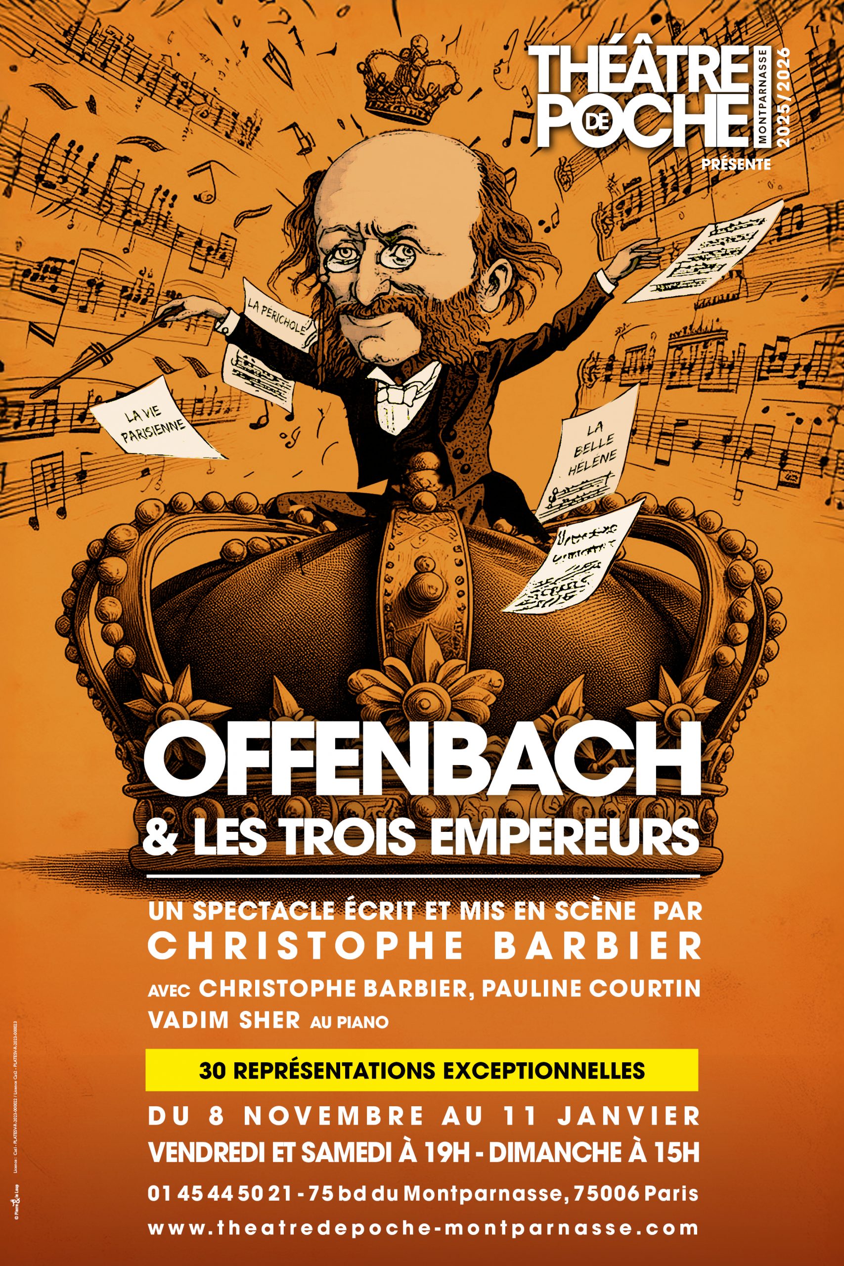 Christophe Barbier, pas barbant du tout en Offenbach, arbore une belle paire de rouflaquettes, Pauline Courtin se réincarne avec brio en la diva Hortense Schneider (…) accompagnés par un mystérieux pianiste « Empereur russe » joué par Vadim Sher. LE CANARD ENCHAÎNÉ