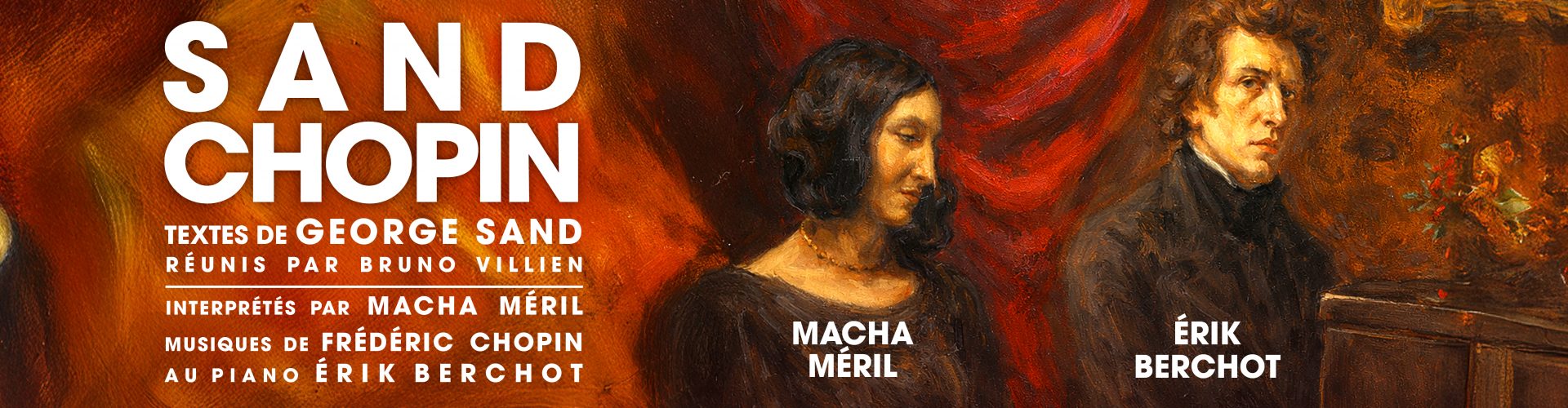 Neuf ans durant George Sand et Frédéric Chopin ont vécu un amour sublimé par leurs talents. Ecriture et musique faisaient bon ménage à Nohant. Macha Méril s’empare entre autres textes d’Histoire de ma vie, autobiographie visionnaire où Sand délivre son art d’être femme avec une profonde intelligence. Au piano s’exprime, sous les doigts d’Erik Berchot, la fougue sensible de Chopin. Un duo légendaire dont l’œuvre ressurgit ici pour notre inusable plaisir.